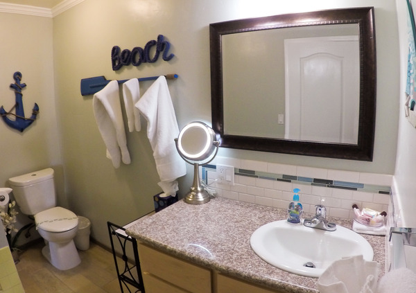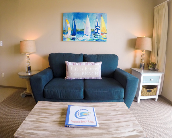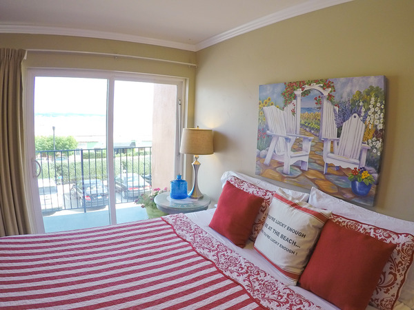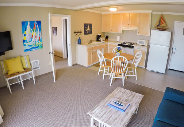 King suite that includes a living room, full kitchen with ocean view, balcony, bathroom w/ shower and carport parking.
